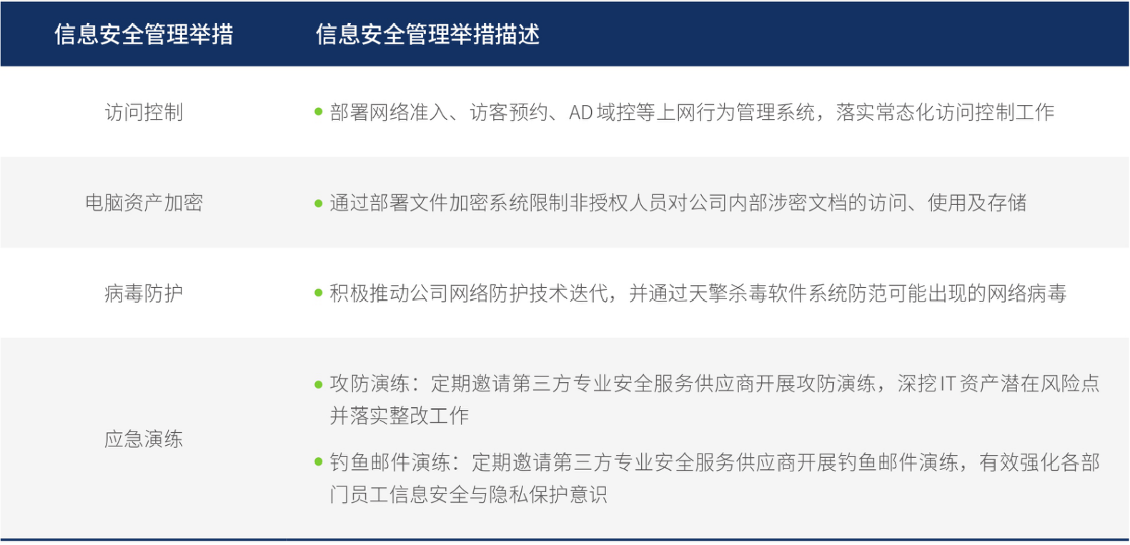 公司高度重视企业与个人信息安全与隐私保护工作。公司依照《中华人民共和国数据安全法》《通用数据保护条例(GDPR)》等海内外法律法规及《信息系统安全管理制度》《商业秘密管理制度》等内部制度指引,结合企业国际化发展需求及行业最佳实践,构建起完善的信息安全与隐私保护管理体系,并由保密管理办公室协同公司各部门与子公司落实信息安全管理举措,有效保障企业海内外业务数据的完整性、保密性及透明度。